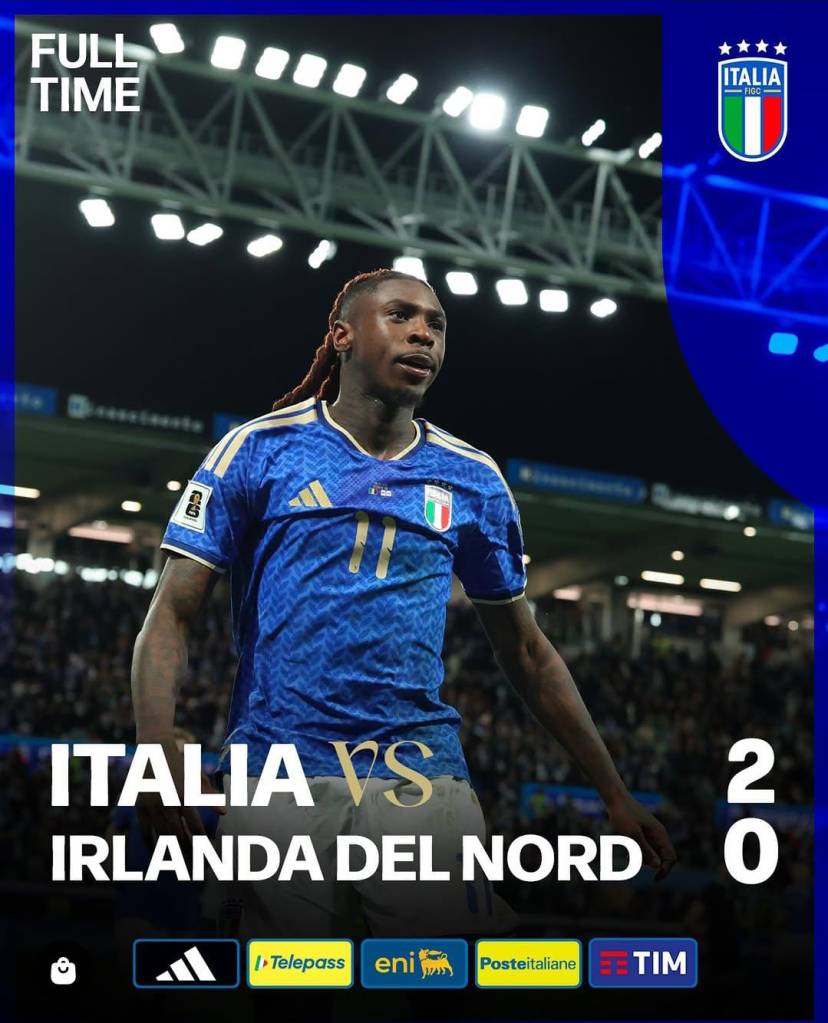 Na Europa, a tetracampeã Itália, que ficou fora das últimas 2 Copas do Mundo, marcou em uma repescagem após duas edições passando em branco e fez o dever de casa, vencendo a Irlanda do Norte por 2 a 0, em Bérgamo. Com a vibração do técnico Gattuso e sua comissão, que conta com Gianluigi Buffon e Leonardo Bonucci, os italianos chegaram aos gols após um bonito chute de Sandro Tonali, da entrada da área, que depois deu uma bela assistência para Moise Kean dar números finais ao placar.